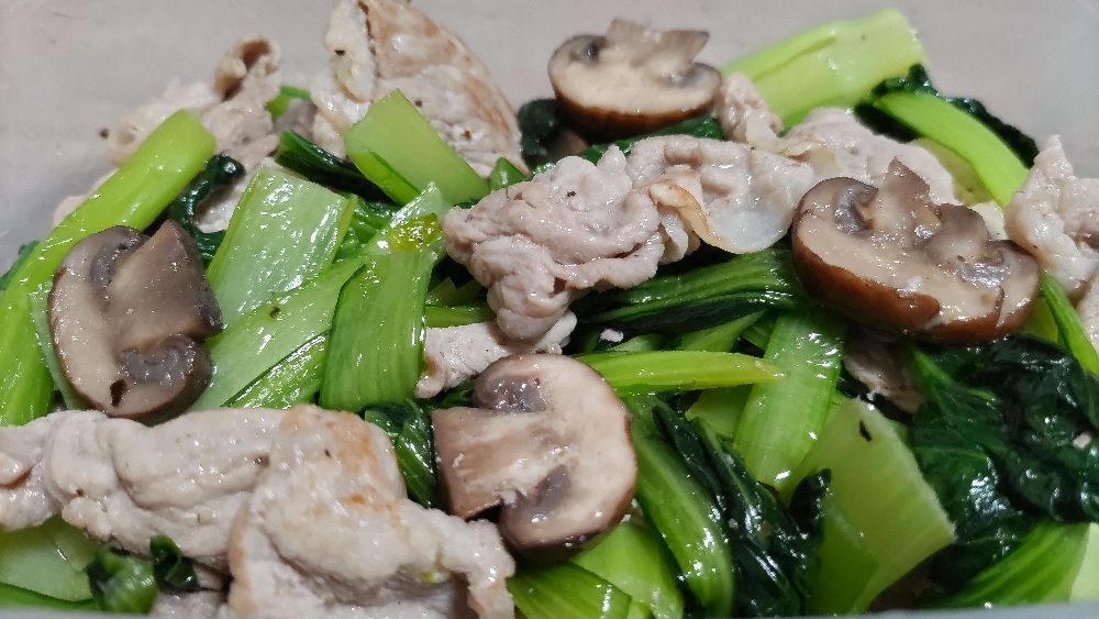 ちぢれ小松菜とマッシュルームと豚肉の炒め物。