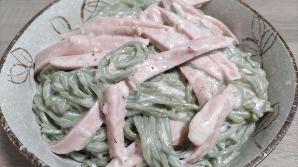 戸棚に余ってたパスタではなくそば寄り乾麺(よもぎ麺)。