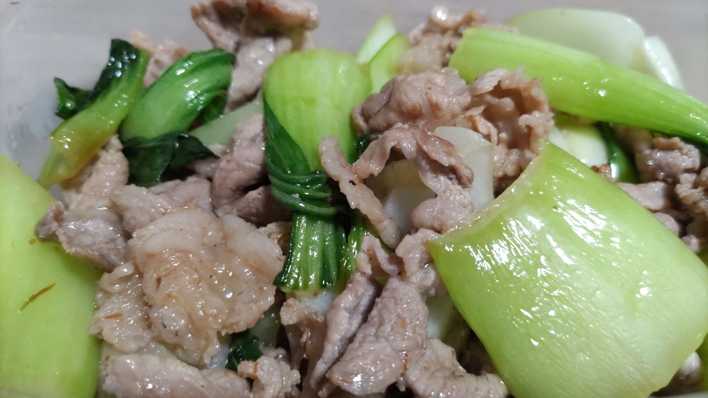 250円くらいの量の豚コマ肉と、二束98円のチンゲン菜。