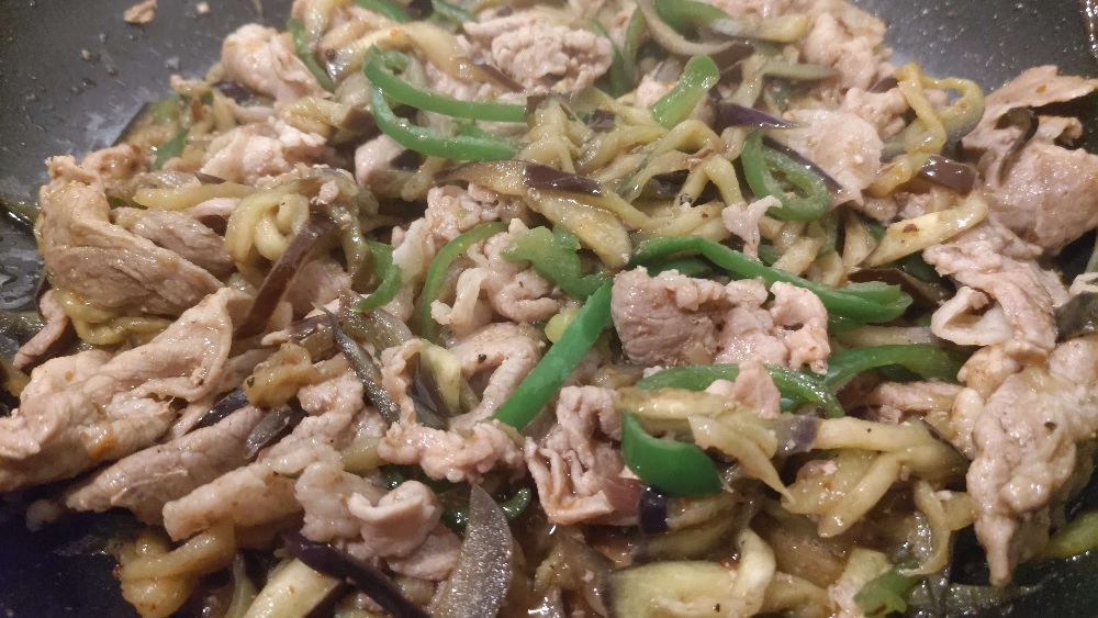 茄子とピーマンと豚コマでXO醬炒め。